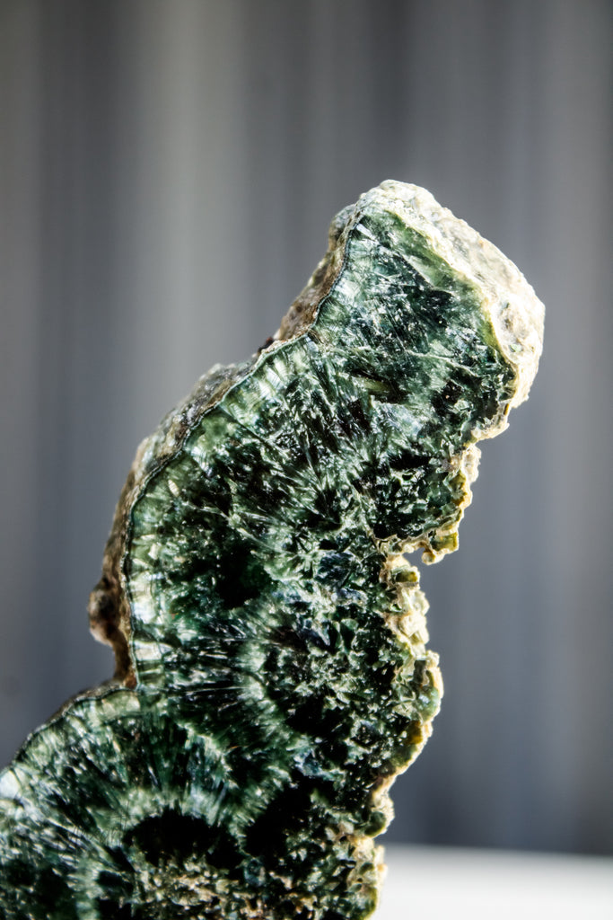 Seraphinite is a variety of clinochlore in the chlorite group. Its silky, feathery chatoyance comes from platy mineral layers that reflect light in thin, shimmering bands. It crystallises in the monoclinic system and is quite soft on the Mohs scale (about 2–2.5), so treat polished pieces with care. The classic material comes from the Lake Baikal region of Siberia.