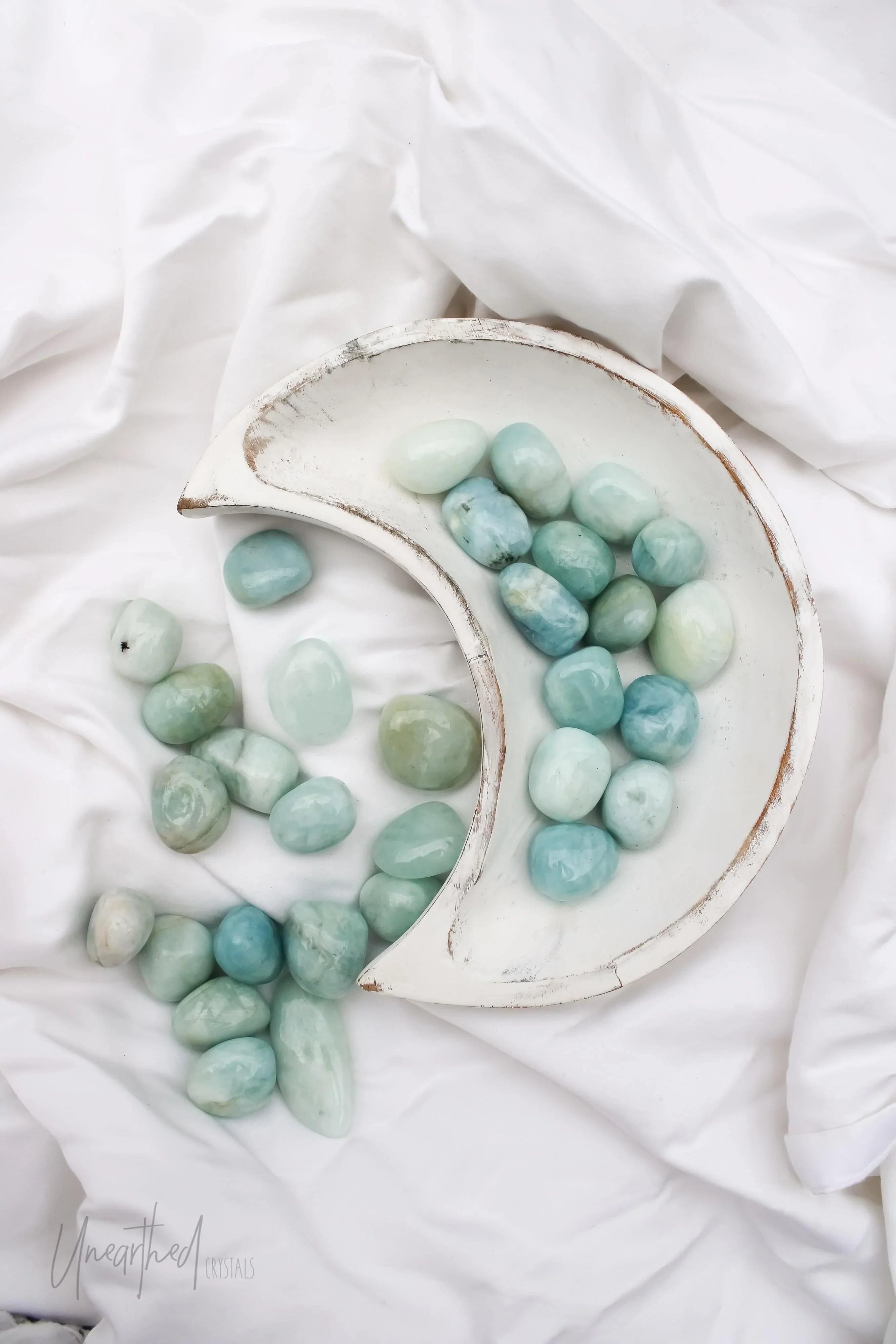 COMPANION STONES: Clear Quartz (for amplification), Larimar (for peace and emotional healing), and Moonstone (for intuition and fluidity).