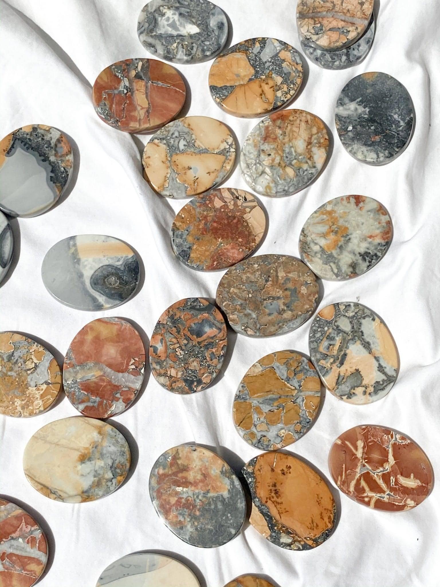 Maligano Jasper is the stone of phoenix energyâa bold, earthy ally that helps you burn through old patterns and rise stronger than ever. With its surreal swirls of grey, ochre, gold, and blue often laced with brecciated matrix patterns, this jasper doesnât just look like a mosaicâit acts like one, rebuilding your energy from the inside out.