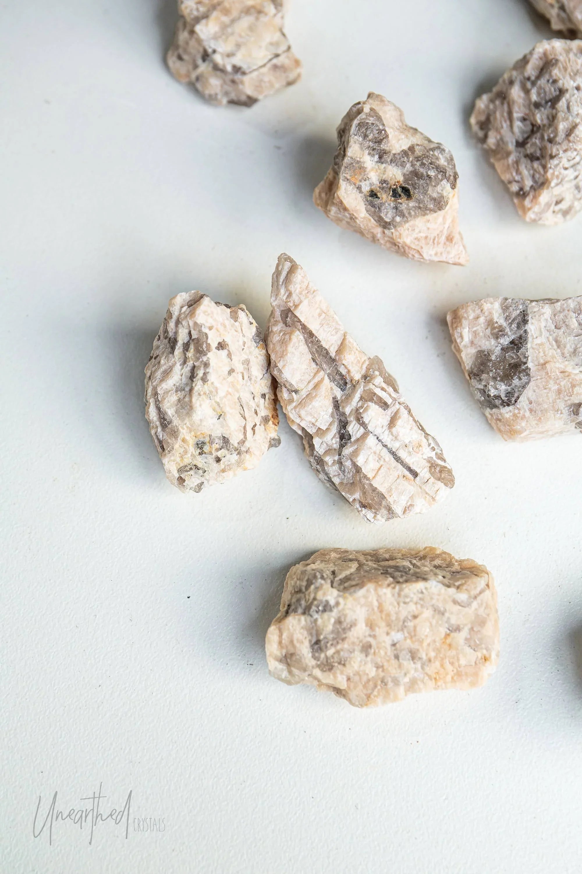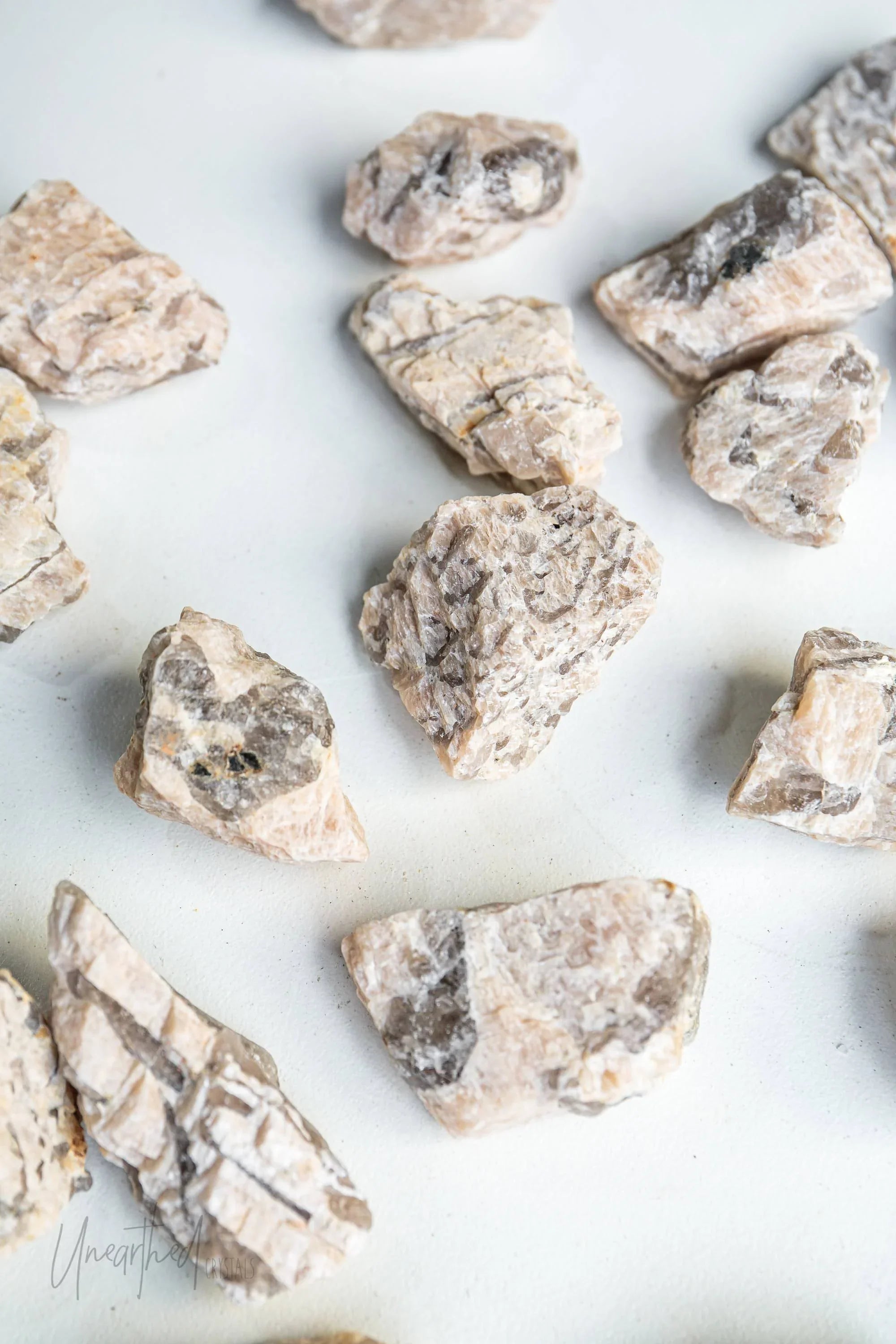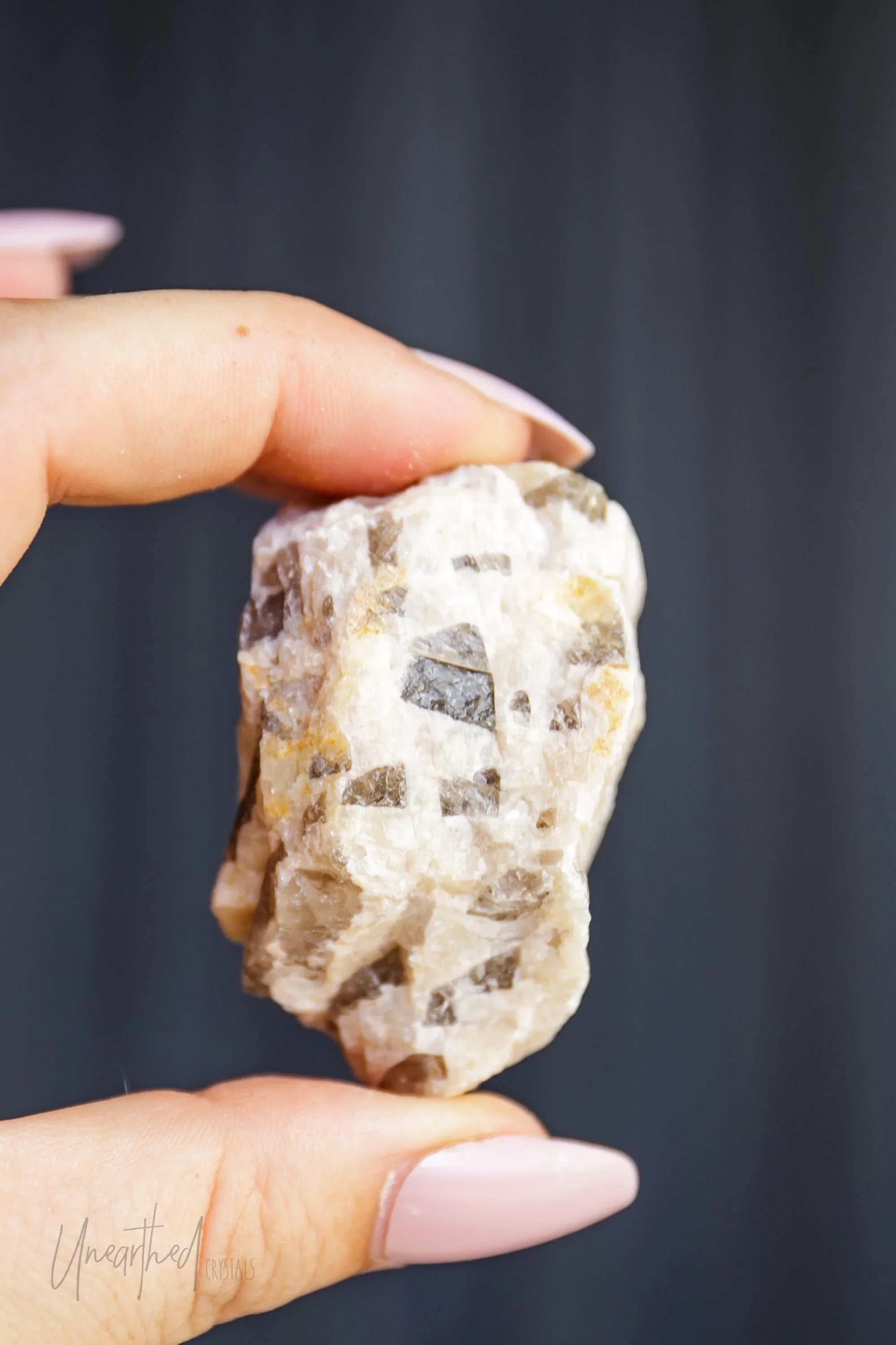 Metaphysically, Graphic Moonstone connects the grounding energy of smokey quartz with the intuitive, divine feminine energy of feldspar. This combo makes it excellent for staying rooted while exploring your spiritual or emotional depths. It works across multiple chakras, helping to harmonise your intuition (Crown and Third Eye) with your sense of safety and stability (Root).