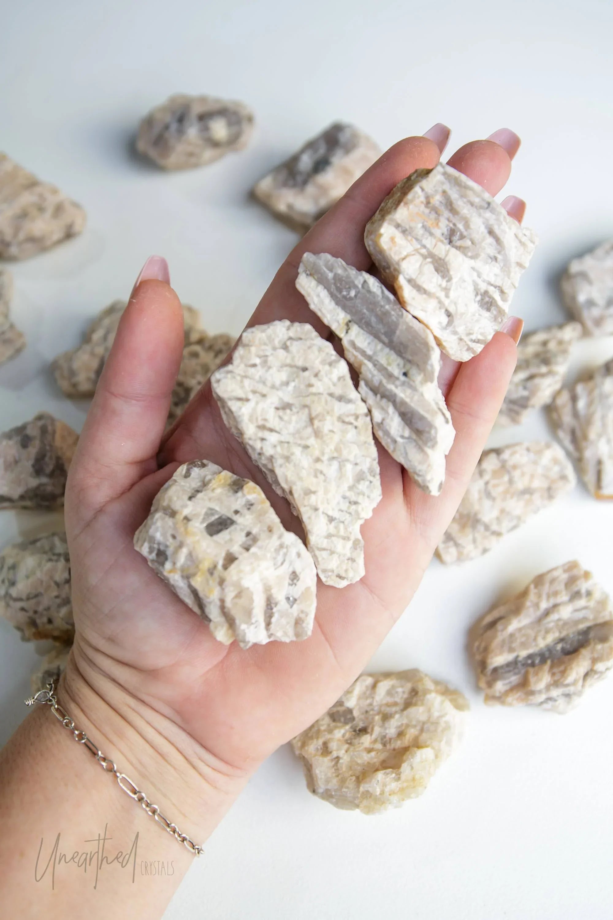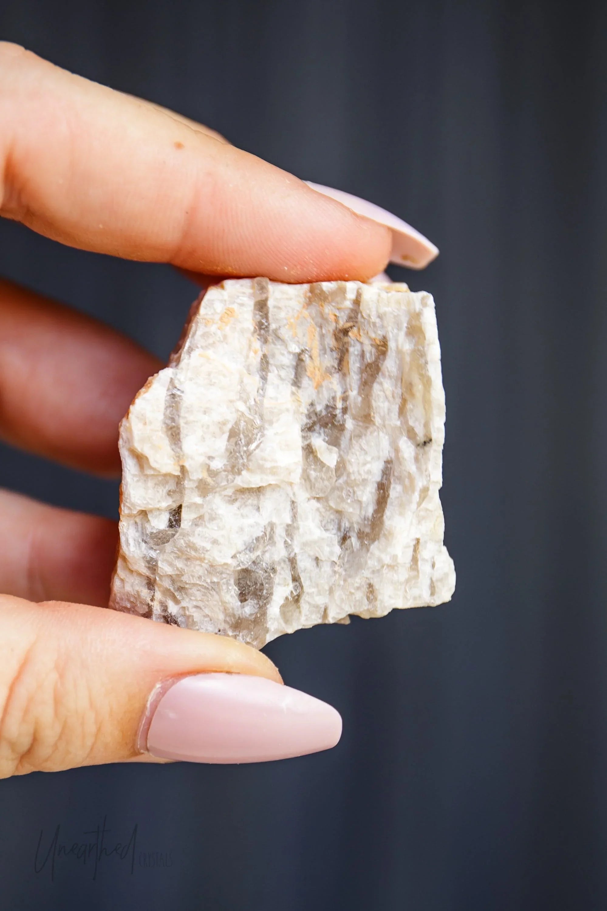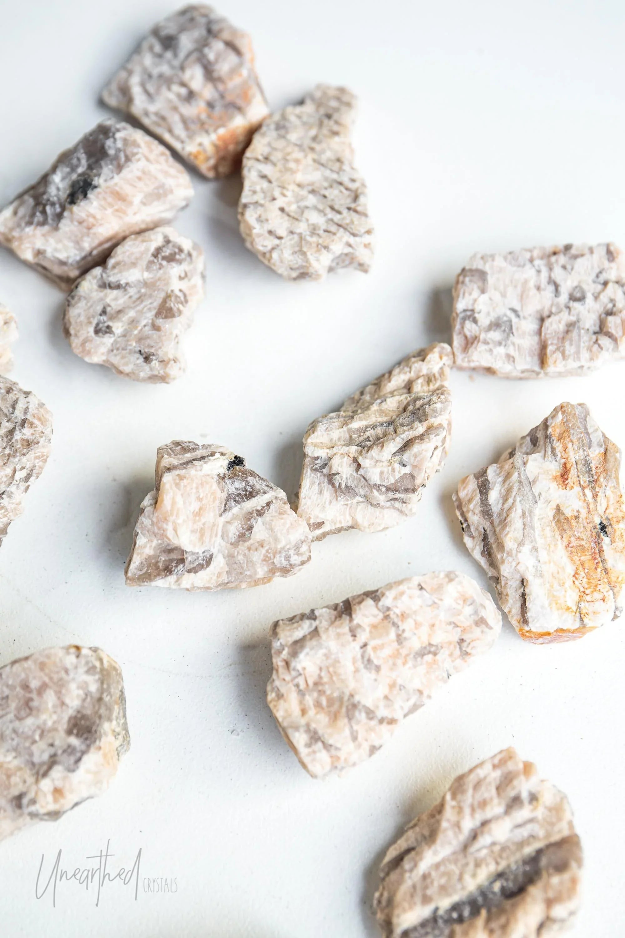 Metaphysically, Graphic Moonstone connects the grounding energy of smokey quartz with the intuitive, divine feminine energy of feldspar. This combo makes it excellent for staying rooted while exploring your spiritual or emotional depths. It works across multiple chakras, helping to harmonise your intuition (Crown and Third Eye) with your sense of safety and stability (Root).