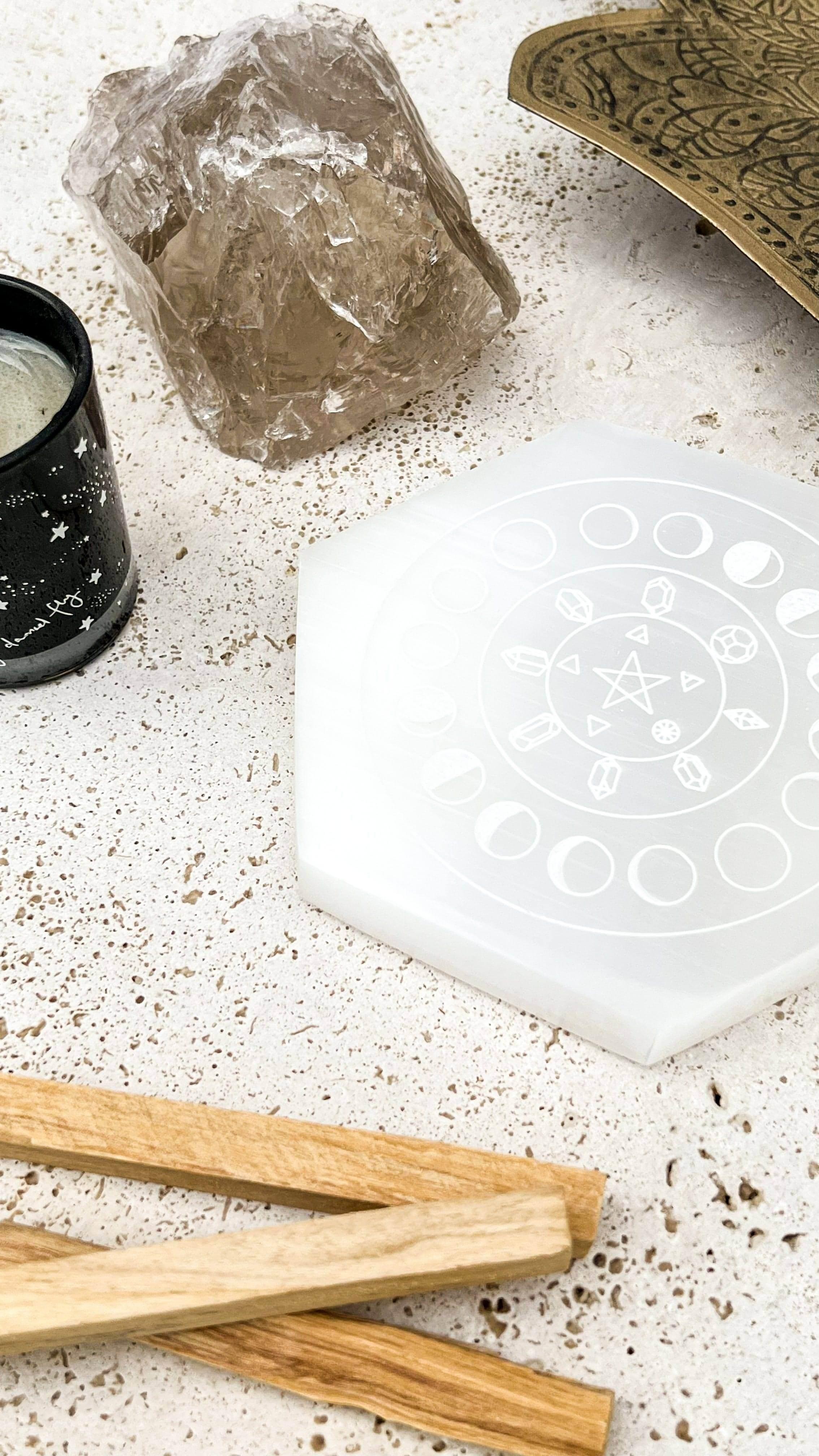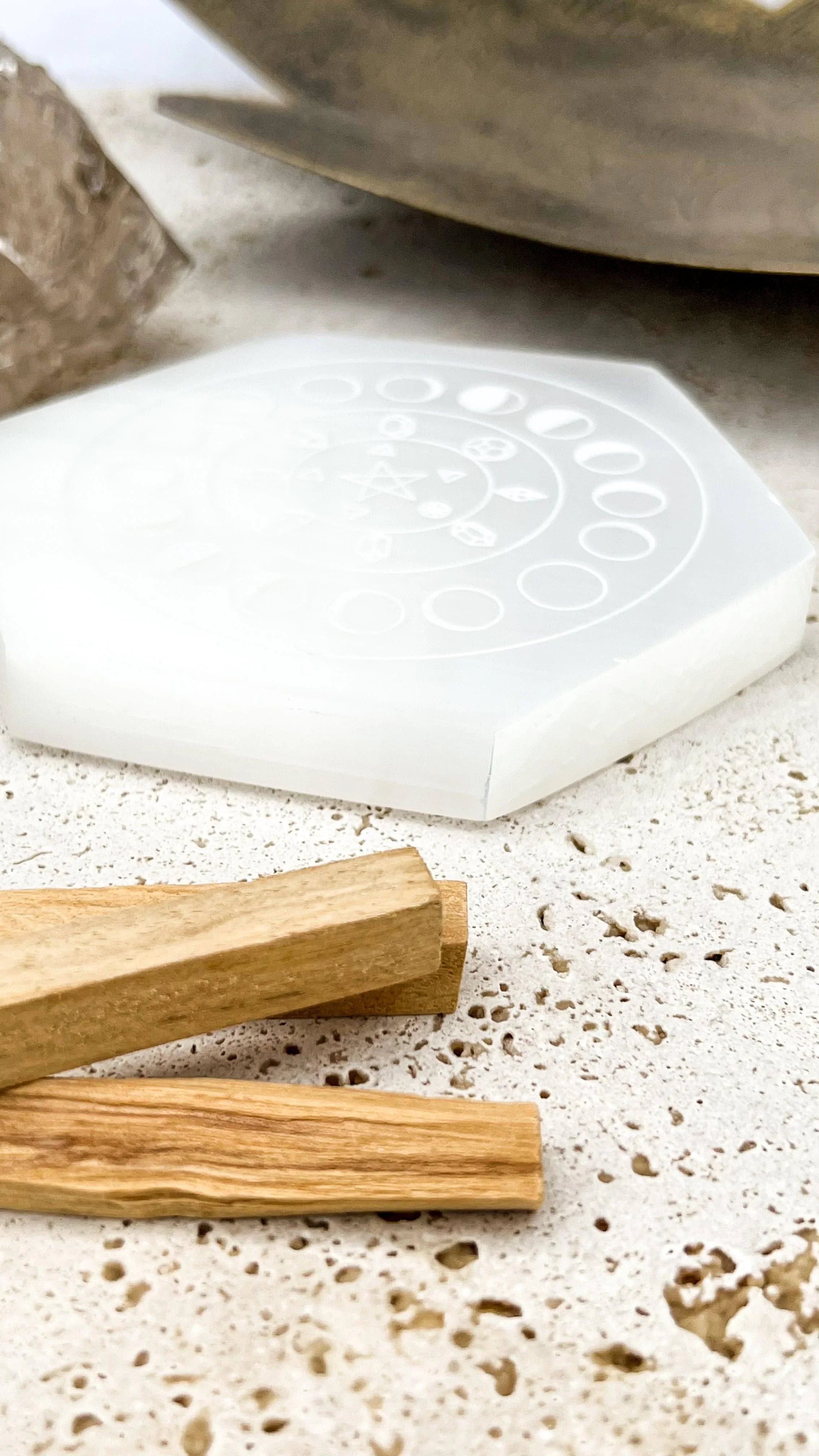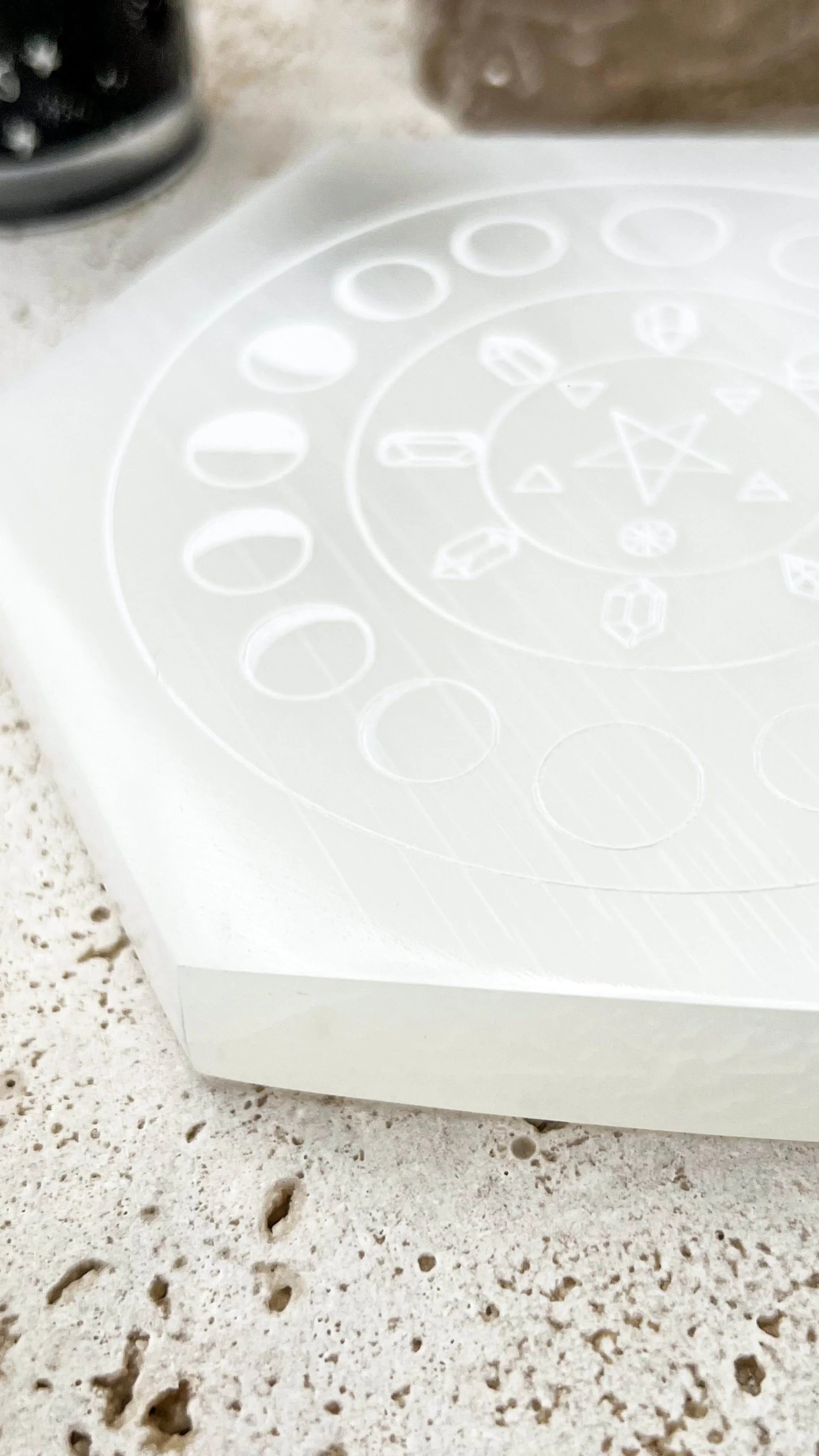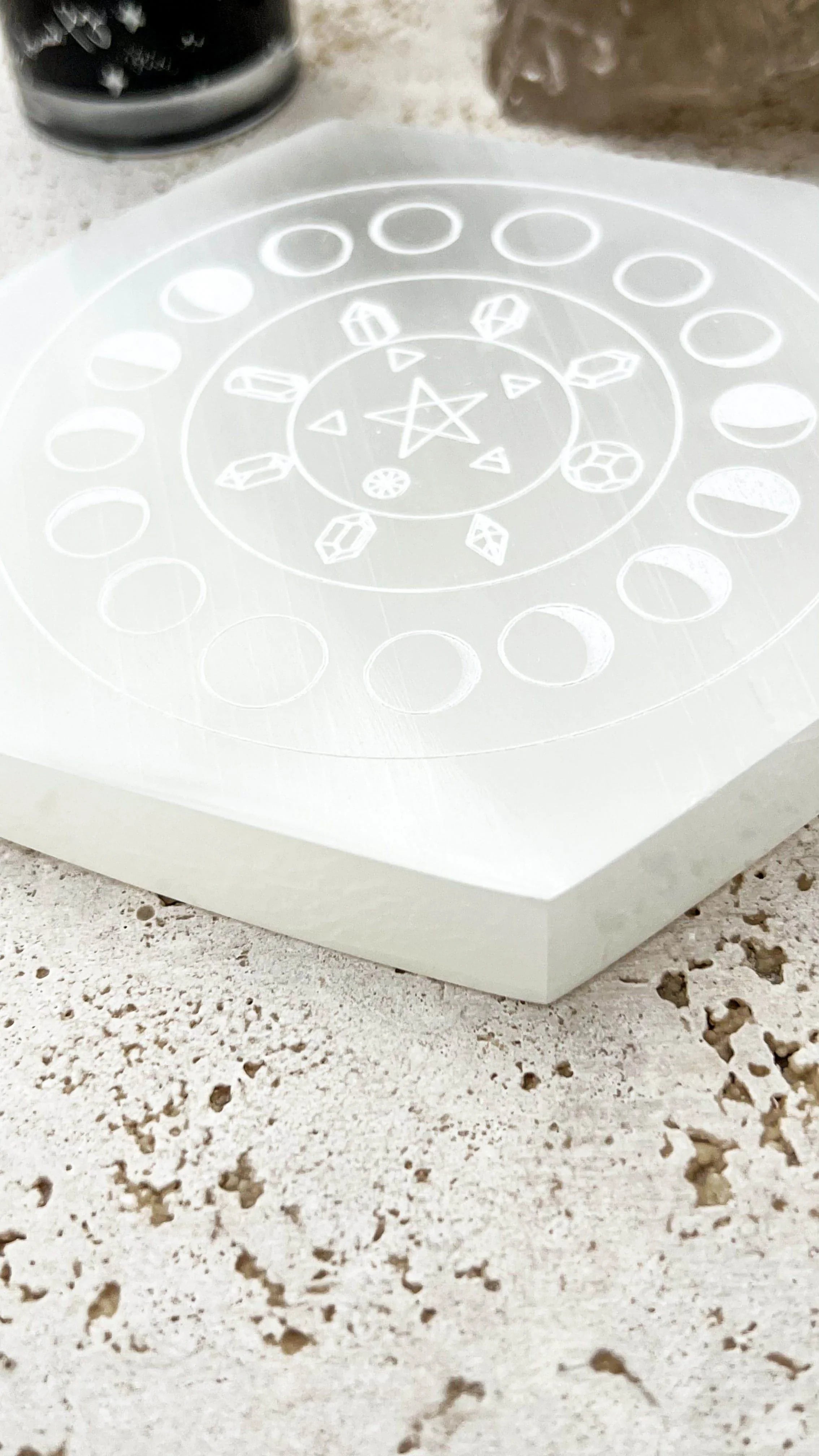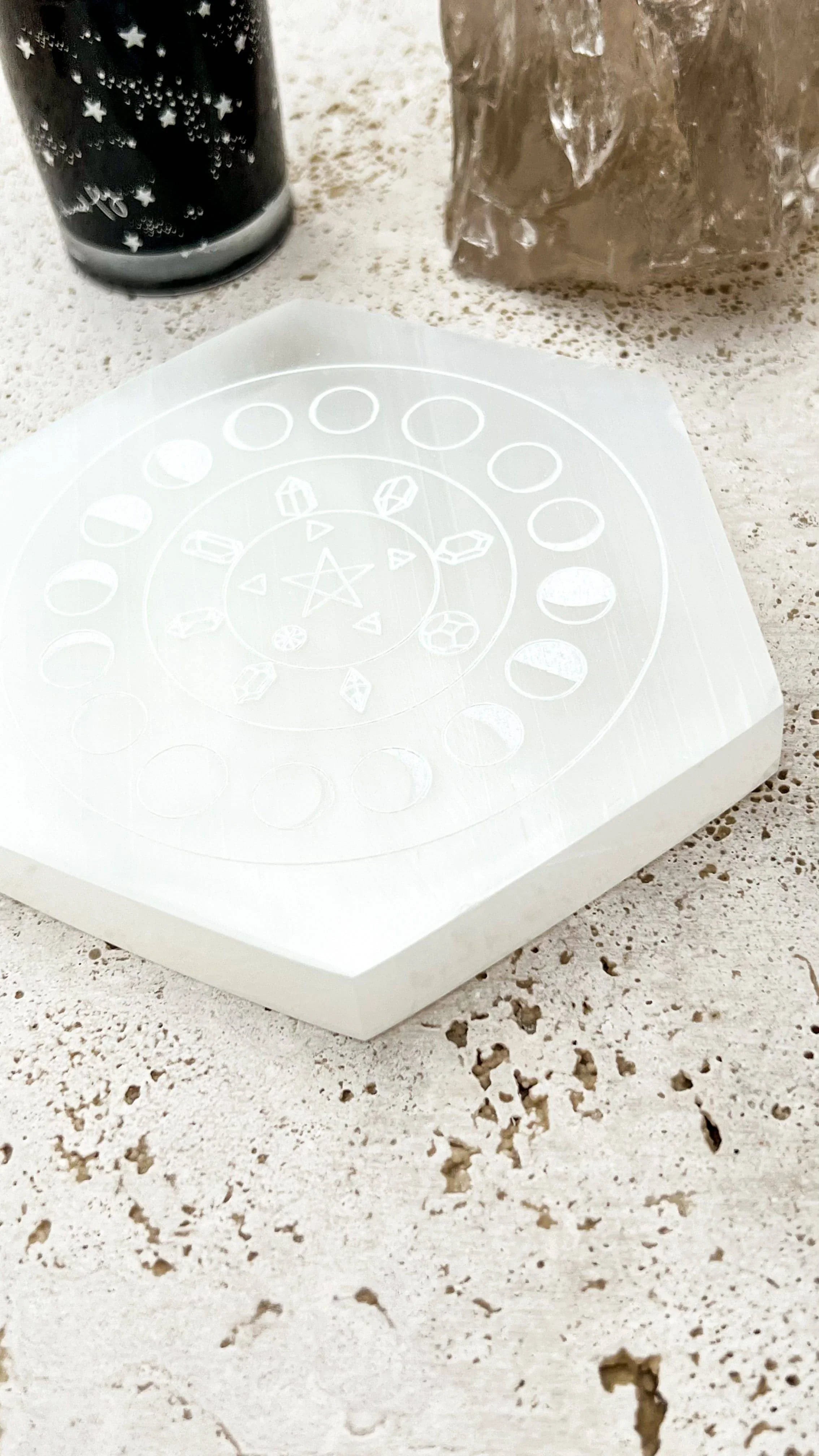 Selenite Hexagon Charging Plate | Phases of the Moon | Large