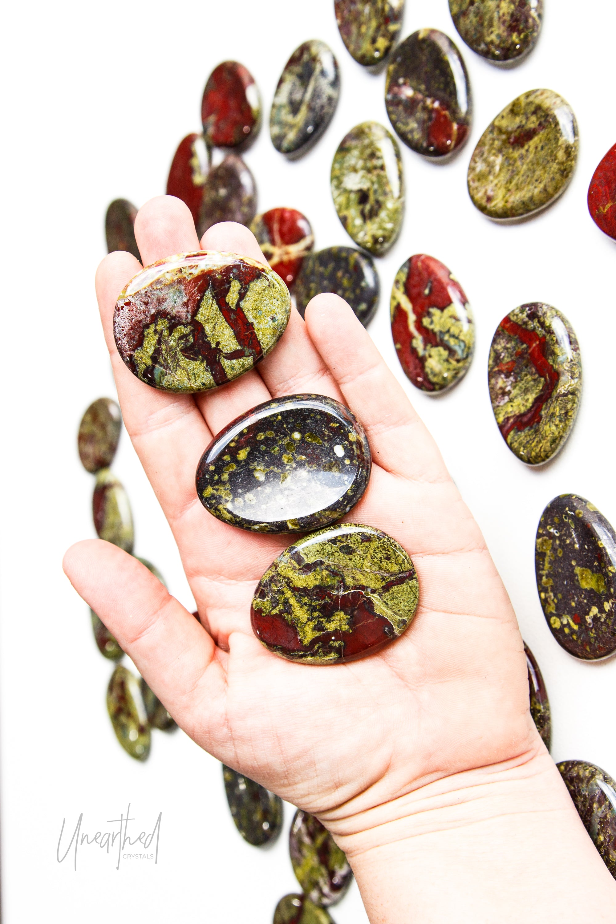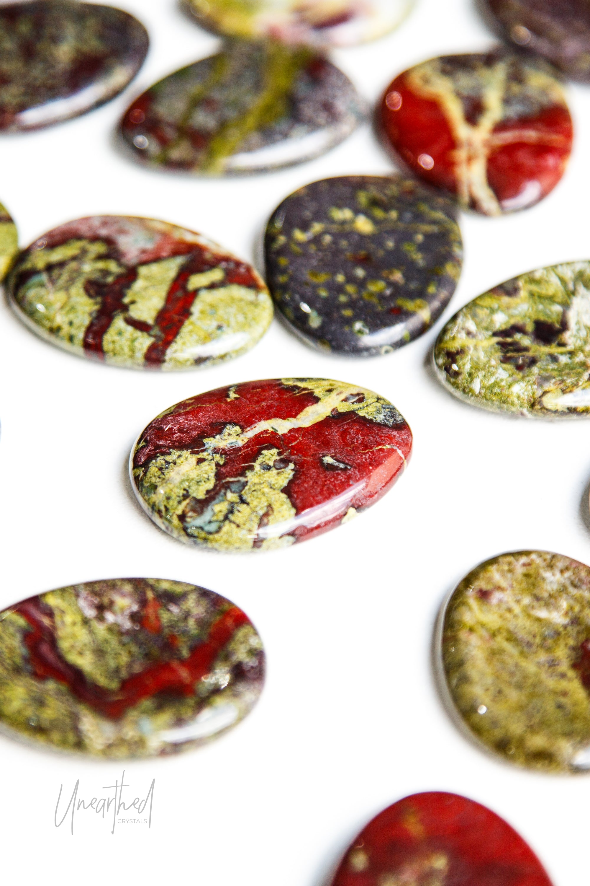 Despite the name, Dragon Blood “Jasper” is typically a metamorphic rock composed of green epidote and red piemontite (both monoclinic members of the epidote group), often with quartz. The green comes from iron-rich epidote; the red is manganese-bearing piemontite. So it’s a jasper by trade name, not strict mineralogy.