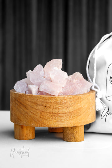 You will receive 500g of raw Rose Quartz crystals individually weighing under 30g each in an Unearthed Crystals cotton drawstring bag.