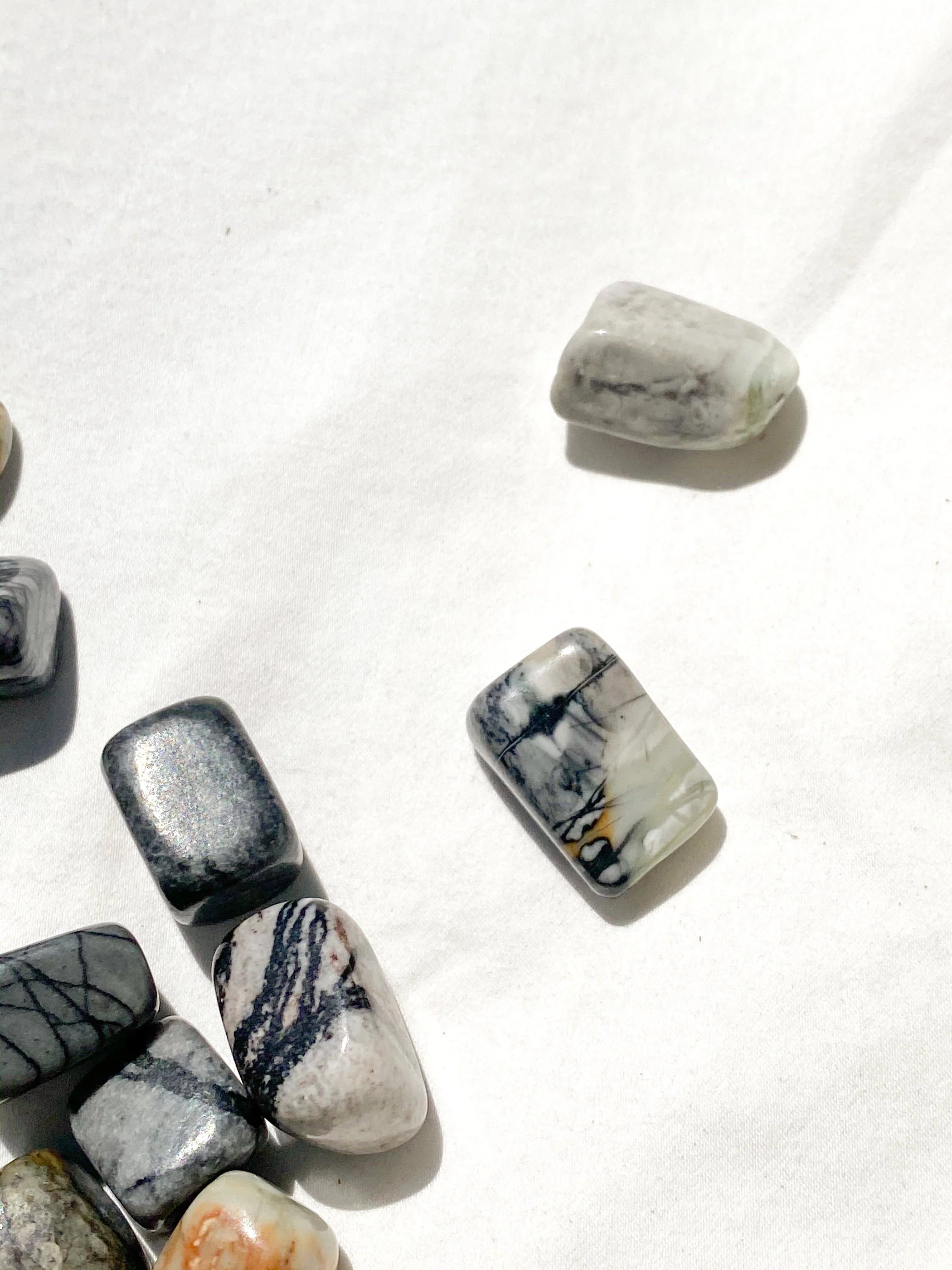 Picasso Jasper is a reminder it is never too late to enjoy life to the full.Ā Hold a Picasso Jasper polished palm or worry stone when you are about to turn down an invitation or feel guilty about taking some self-time.Ā A Picasso worry stone can be used to great effect to enter a light trance state, whether for mediumship, out-of-body travel, contact angels and guides or to enter a deep meditative state.