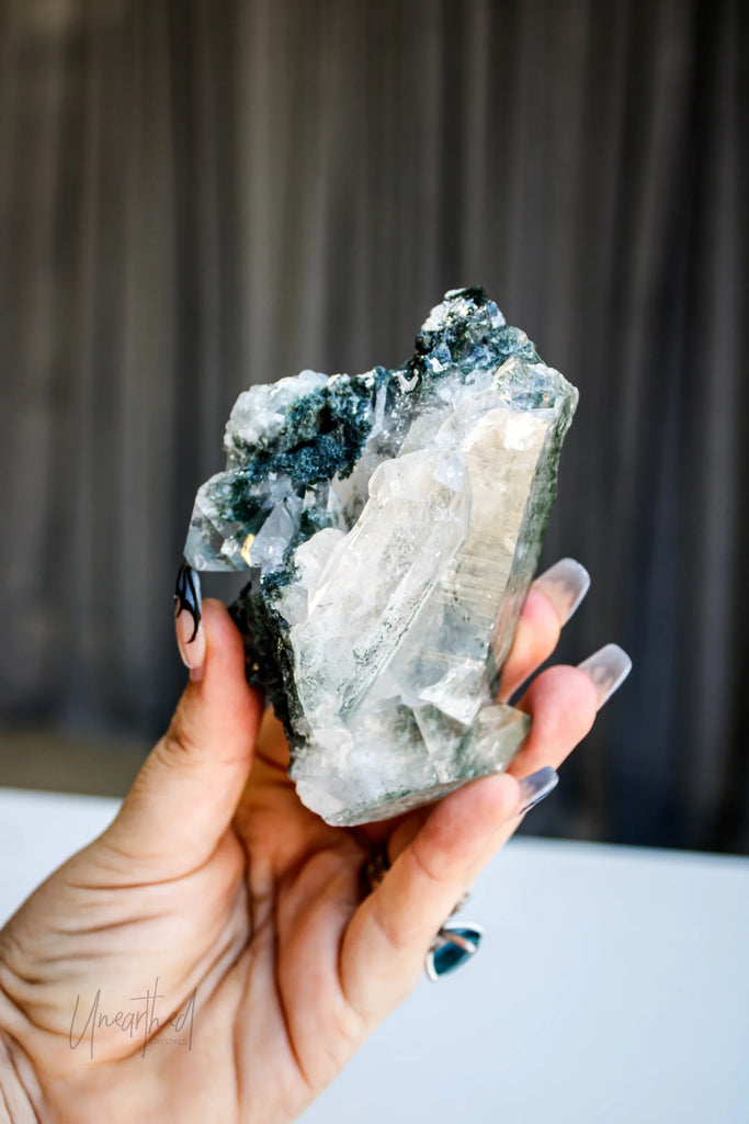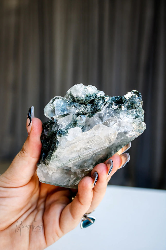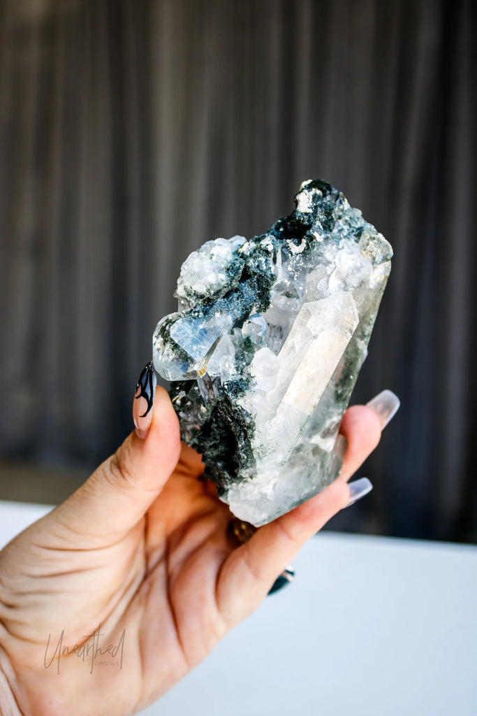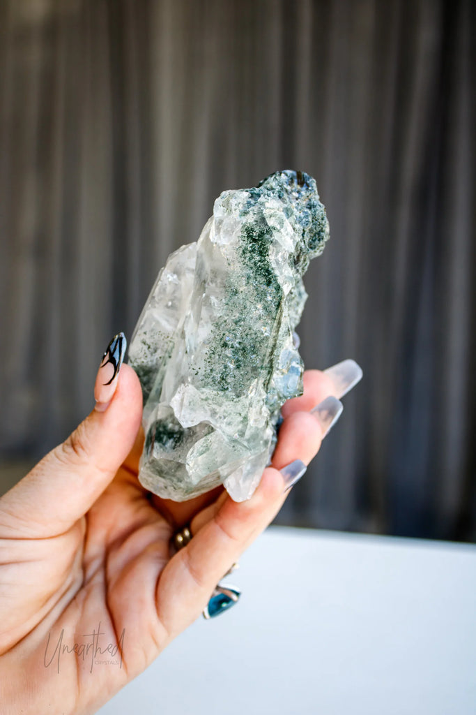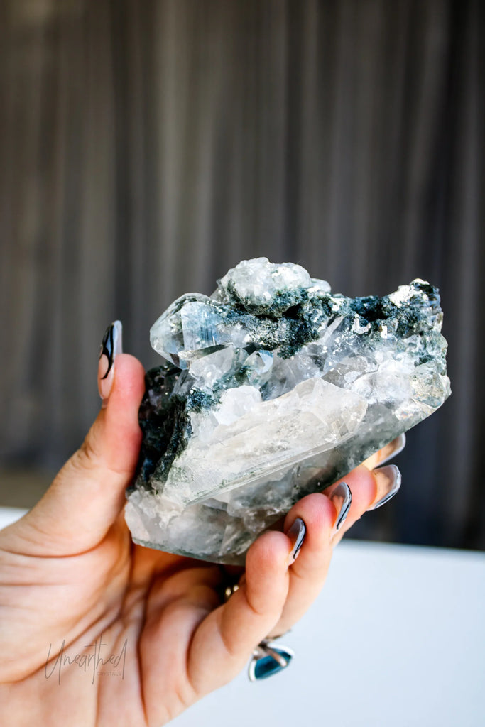 Lodolite links Crown and Third Eye to the Root, so guidance becomes action rather than theory. The quartz matrix amplifies whatever you’re working with; the mineral inclusions add grounded nuance (chlorite for healing; hematite for courage; kaolinite or feldspar for gentle clarity). It’s brilliant for journey work, past-life or inner-child exploration, and manifestation that honours your real-world timelines.
