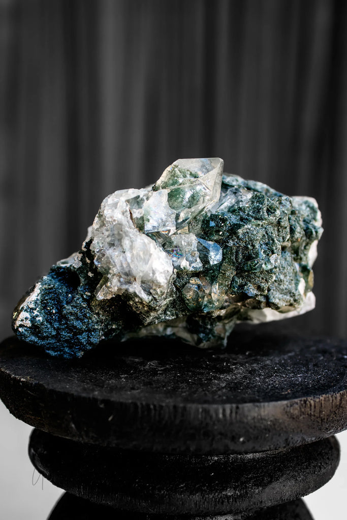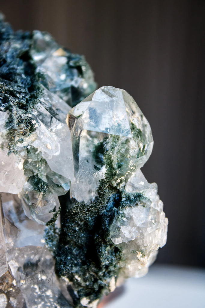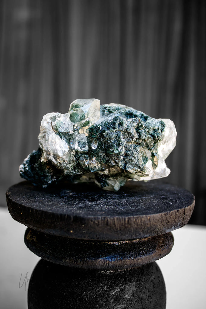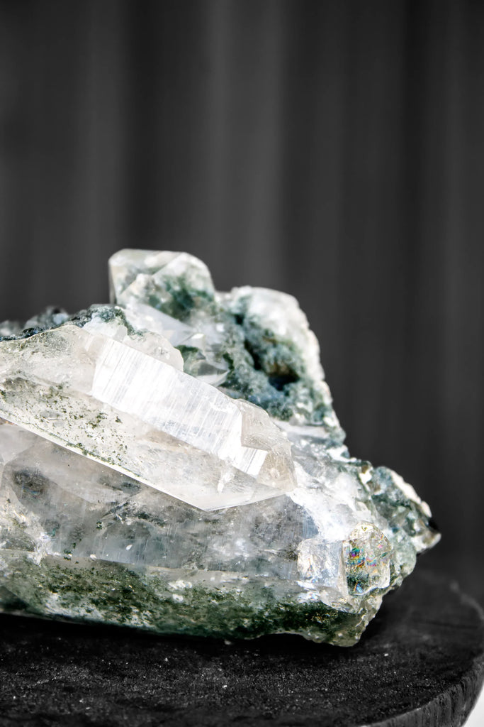 “Lodolite” is a trade name for inclusion quartz: transparent silicon dioxide (SiO₂) in the hexagonal system containing mineral guests such as chlorite, hematite, goethite, feldspar, kaolinite and more. Growth pauses and changing fluids create scenic layers, phantoms and “moss” textures. Most highly aesthetic material comes from Brazil’s Minas Gerais, where hydrothermal solutions left these miniature landscapes inside quartz cavities.
