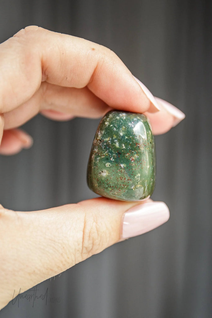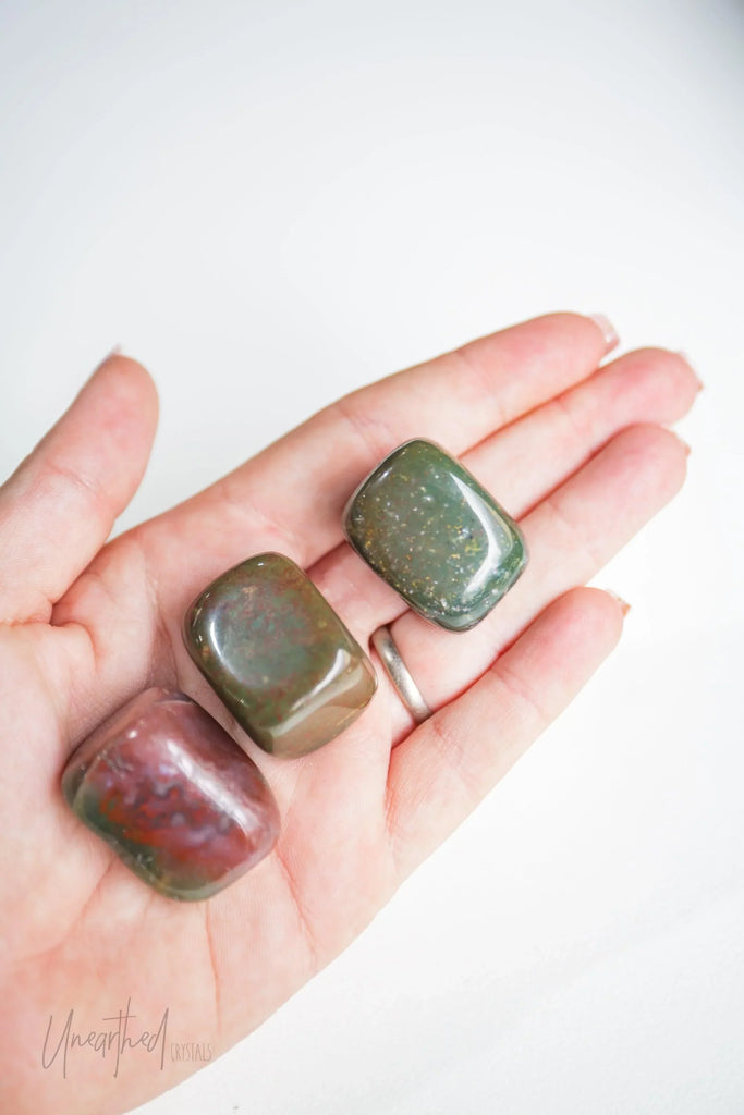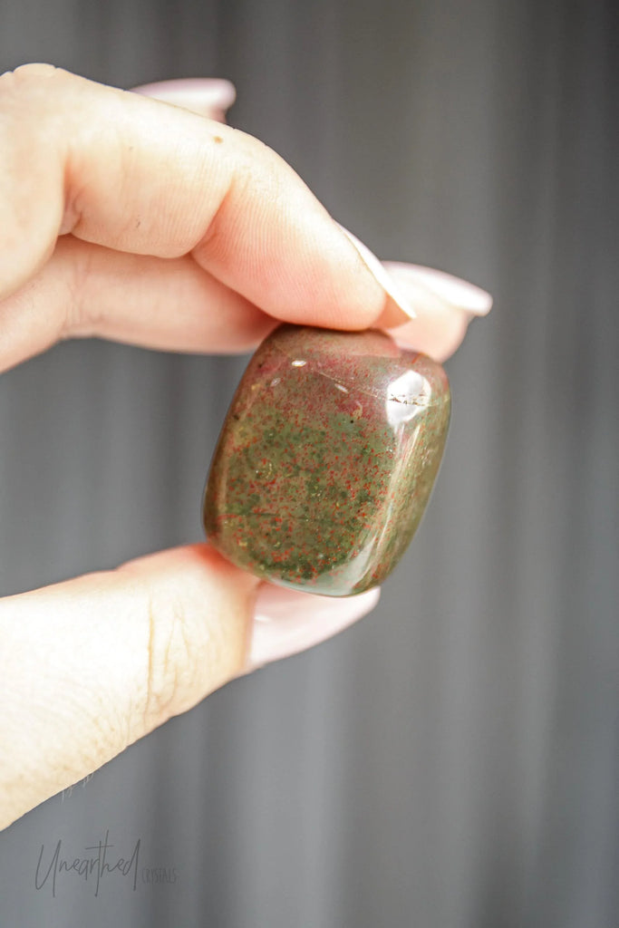 Spiritually, Bloodstone has a strong connection to vitality and strength. Its energy can revitalise your aura, help you align with your higher purpose, and empower you to break through personal barriers. It also helps ground and protect you, making it great for spiritual practices like meditation or energy work.