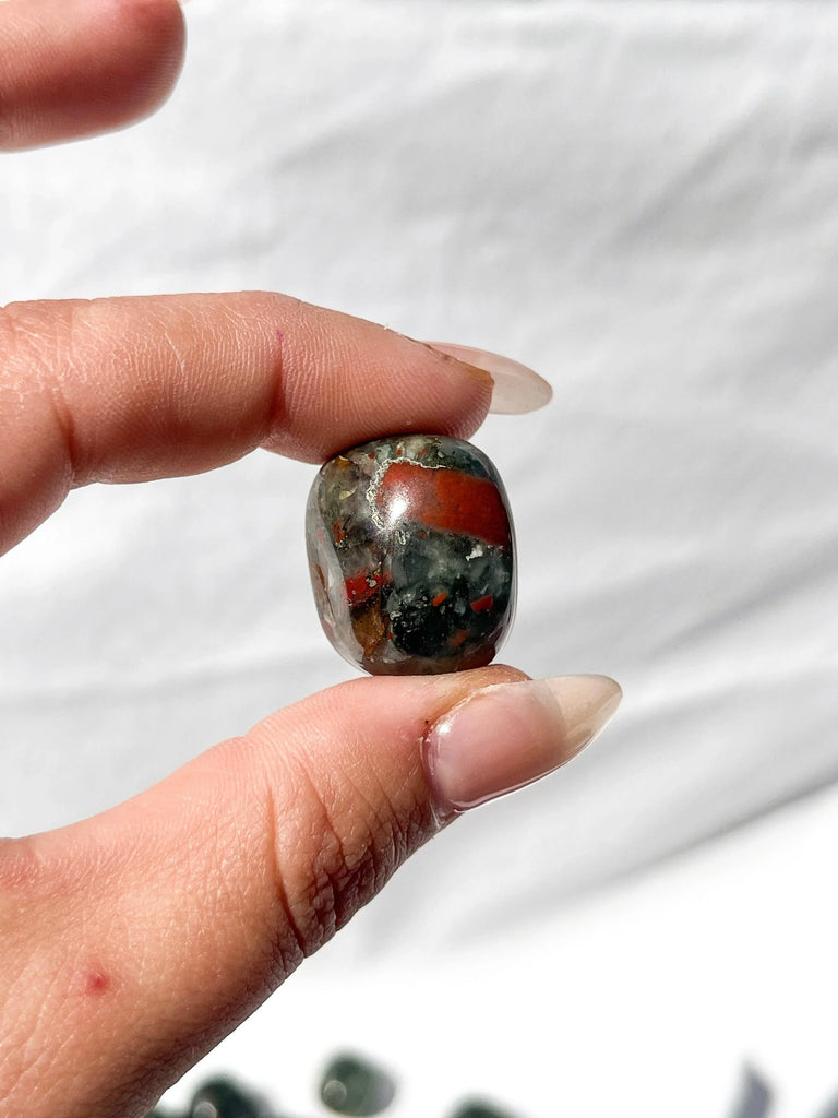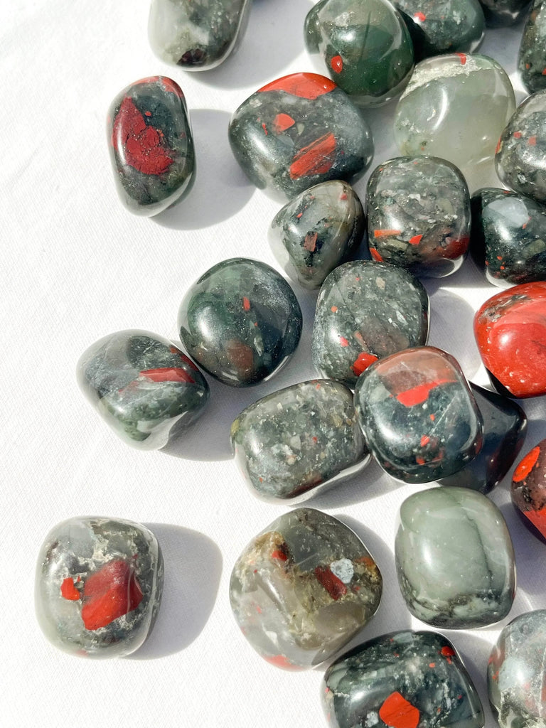 Spiritually, Bloodstone has a strong connection to vitality and strength. Its energy can revitalise your aura, help you align with your higher purpose, and empower you to break through personal barriers. It also helps ground and protect you, making it great for spiritual practices like meditation or energy work.