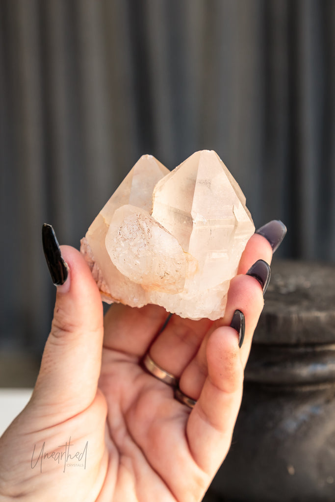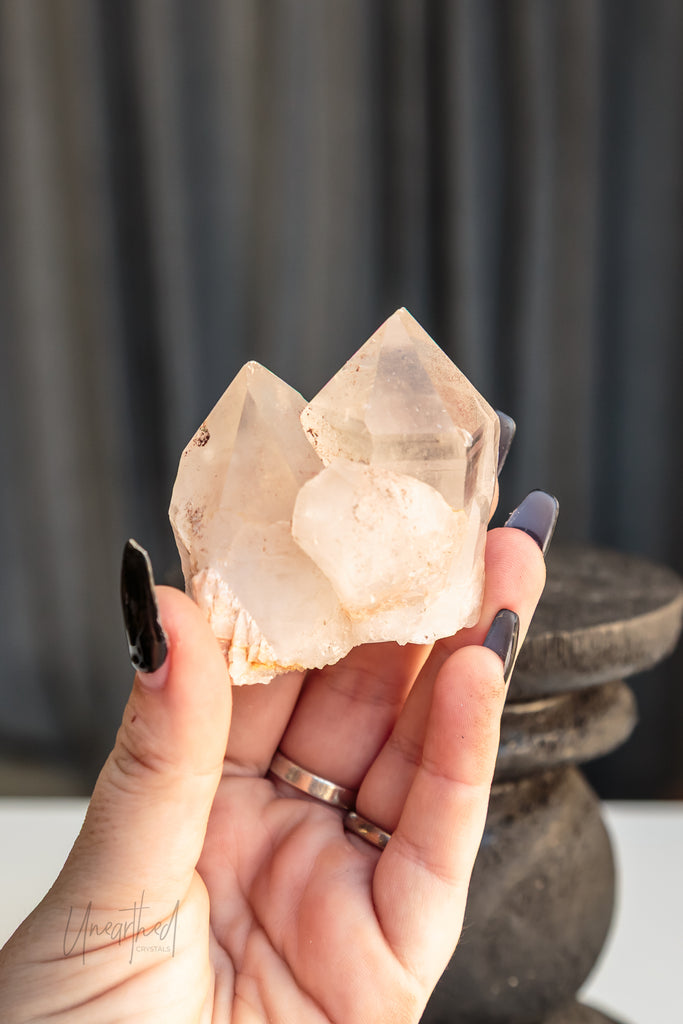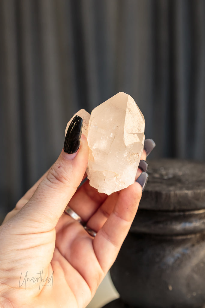 Clear Quartz is a form of Silicon Dioxide (SiO₂) and belongs to the hexagonal crystal system. It forms in long, prismatic points and can often be found in clusters or stunning solitary formations. Its transparency comes from the purity of its growth environment—and even microscopic inclusions can cause fabulous rainbows inside.