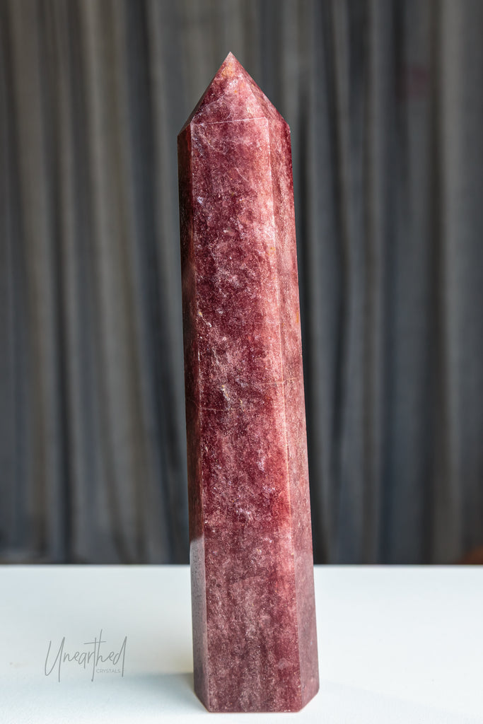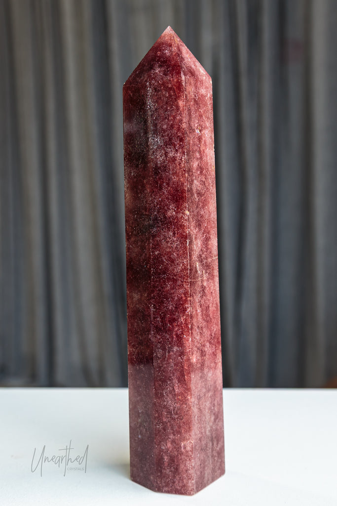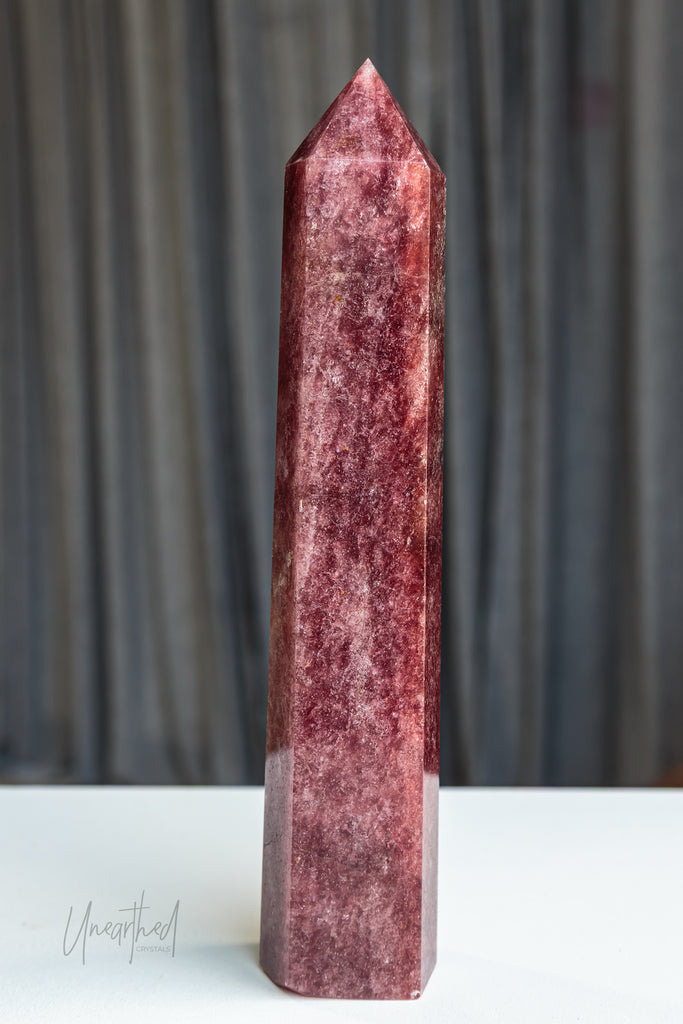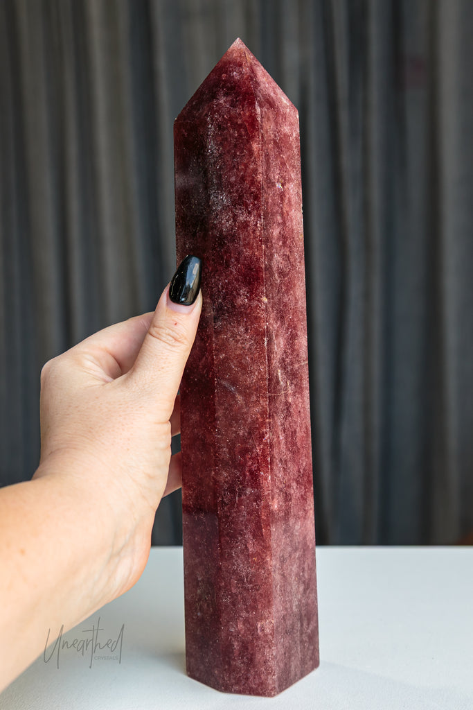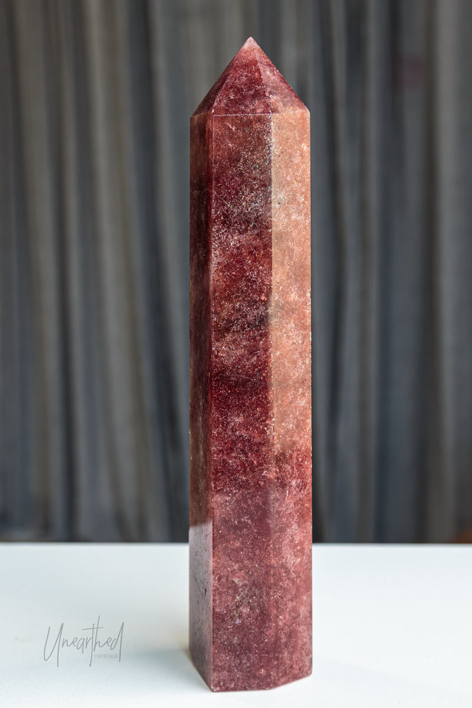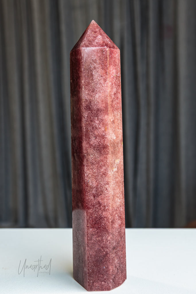 Strawberry Quartz is a variety of Quartz with natural inclusions of iron oxide, hematite, or Lepidocrocite, which gives it its soft pink to reddish hue. Its shimmer can be subtle or dramatic depending on the density of inclusions—and yes, those sparkles are natural, not synthetic!