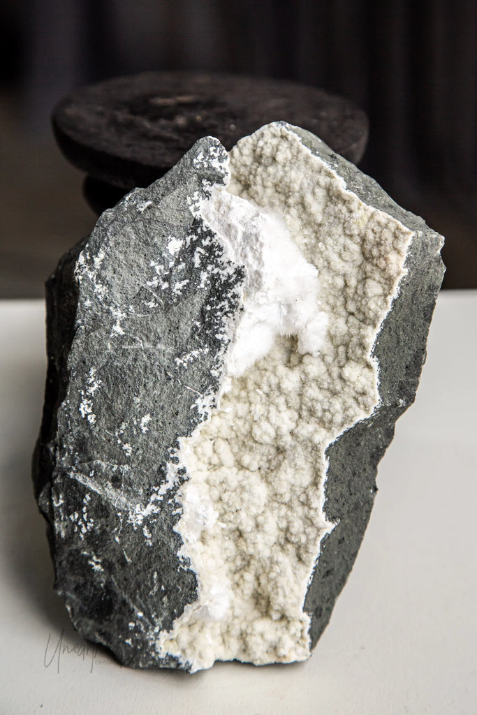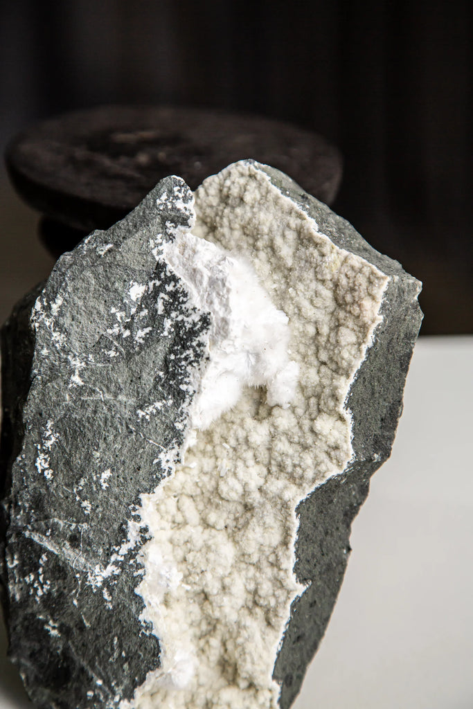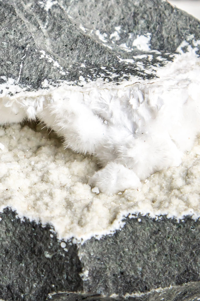 Zeolite isn’t a single mineral—it’s a group of aluminosilicates that are crazy absorbent (think: crystal sponges). Okenite forms as silky, snowball-like tufts in volcanic vugs, and Gyrolite appears as botryoidal (grape-like) spheres, often greenish or pale. Together, they grow in cavities of ancient lava flows, particularly in India, where these stunning combinations are most often found.