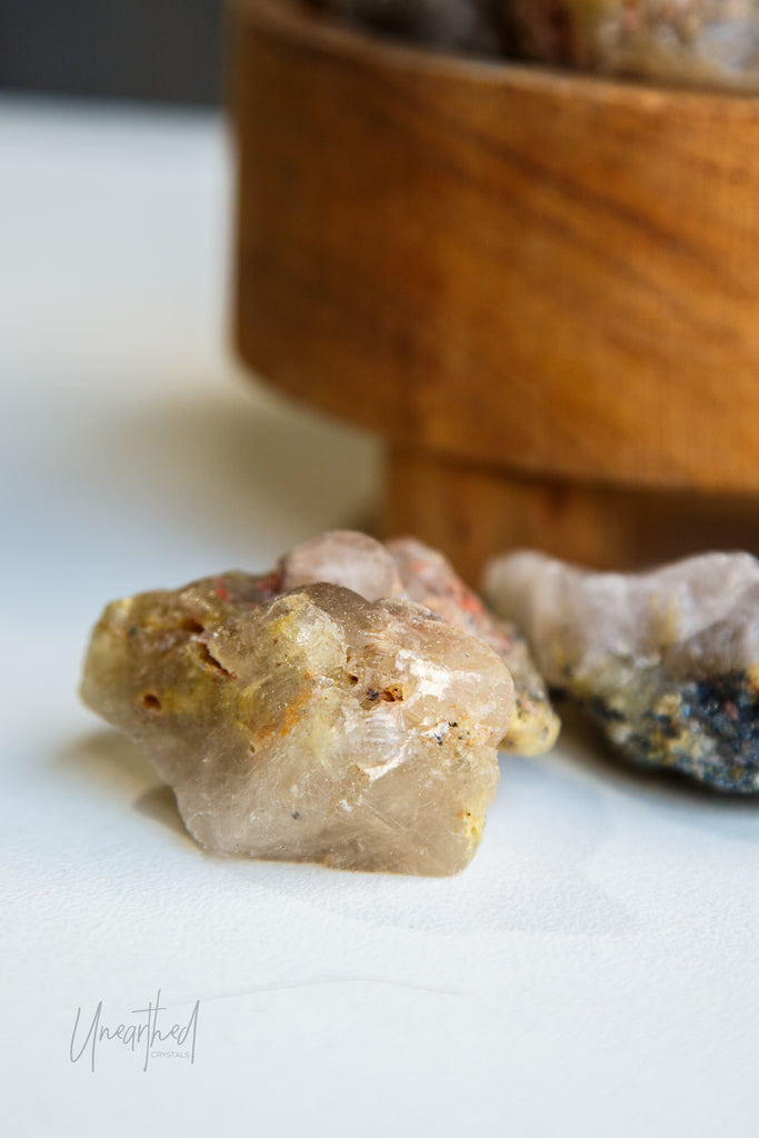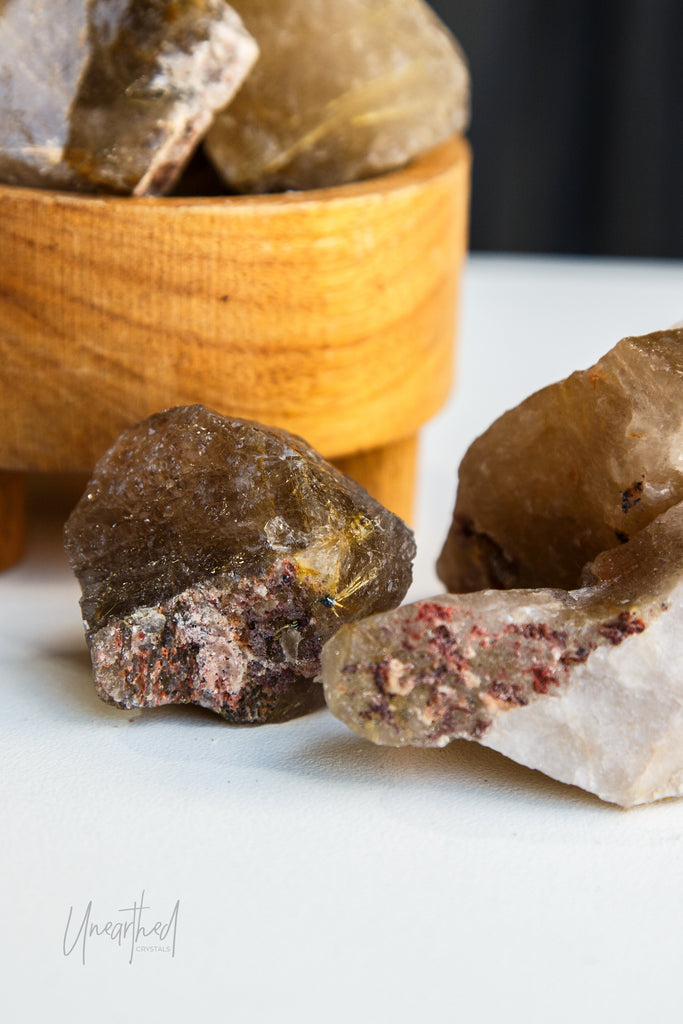 COLOUR: Clear to smoky quartz with golden, copper, or bronze Rutile inclusions