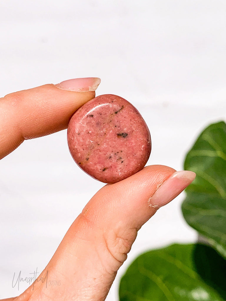 Rhodonite is also a calming stone, with energies used for easing anger as well as calming stress and anxiety. It is said to bring emotional balance, and as such bring confidence in one's life in many areas. Rhodonite is also a stone of contrasts. The pinks indicate energy that enhances love and is used in metaphysics to attract a good mate. This stone can help one have a passionate love that is also grounded or help mend a broken heart.