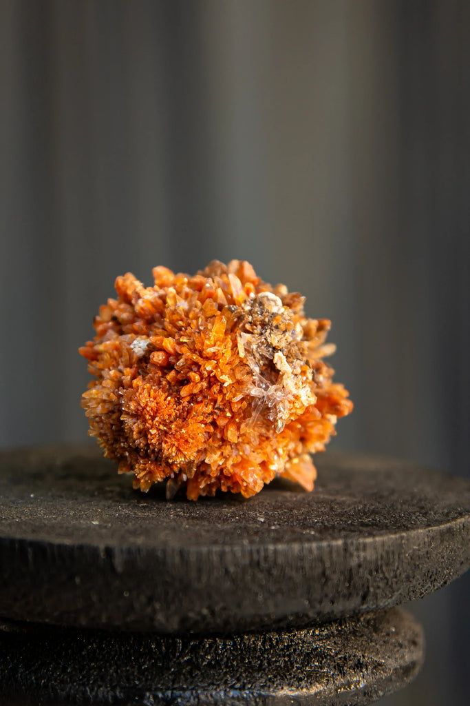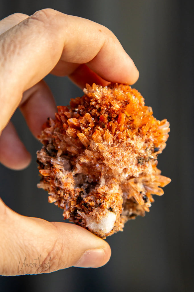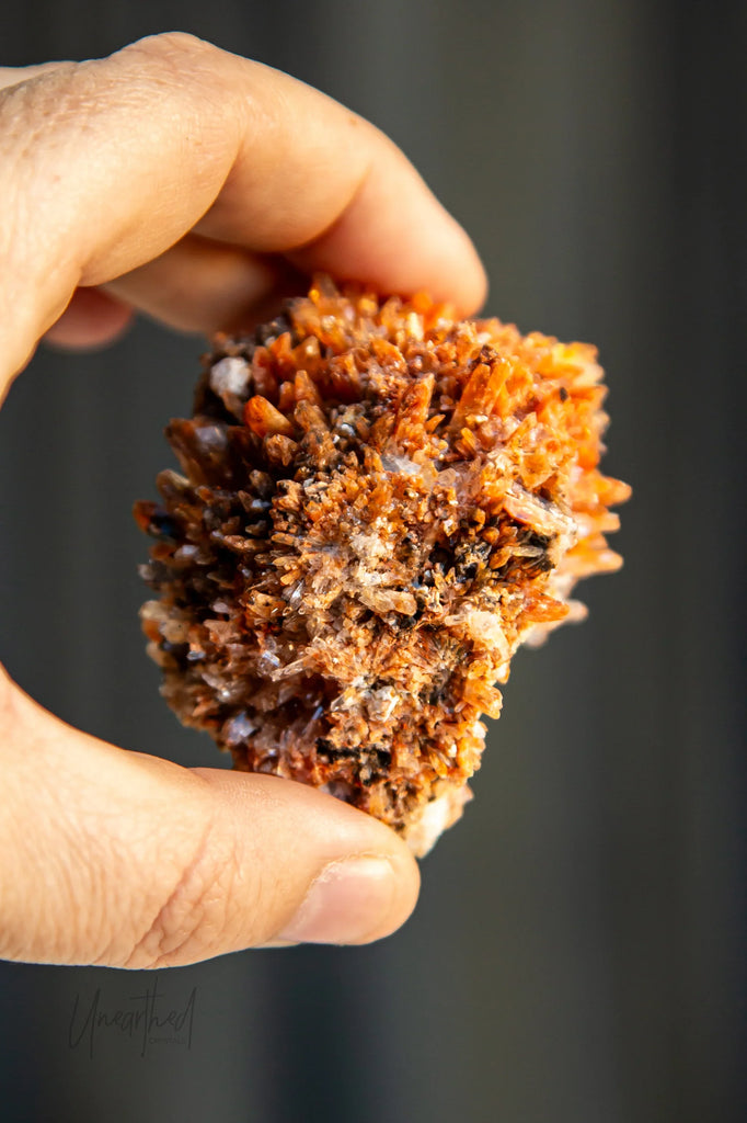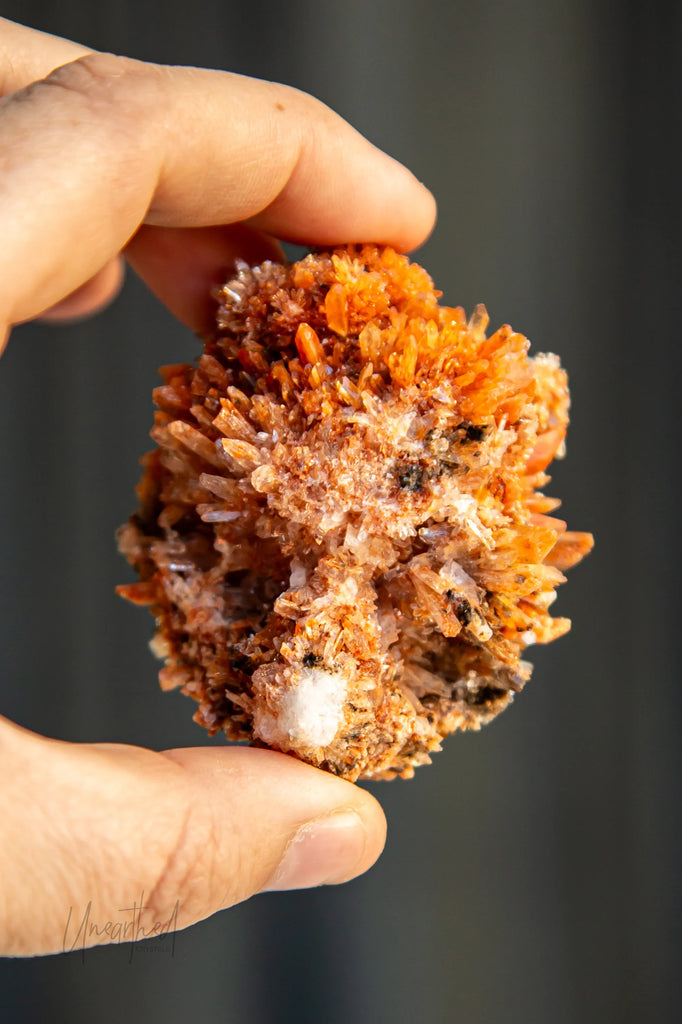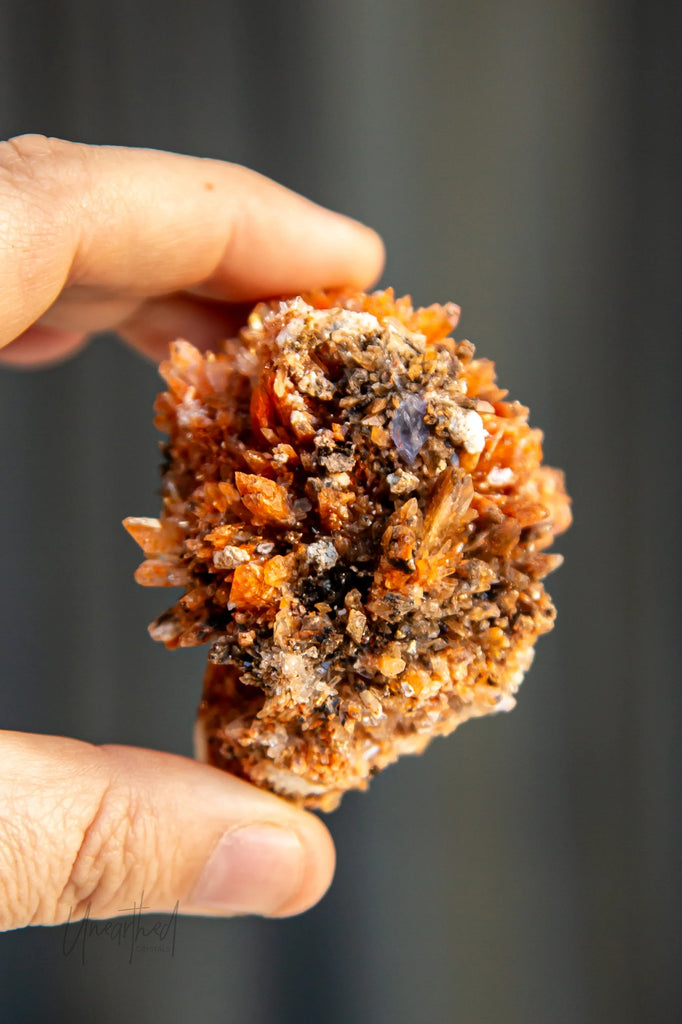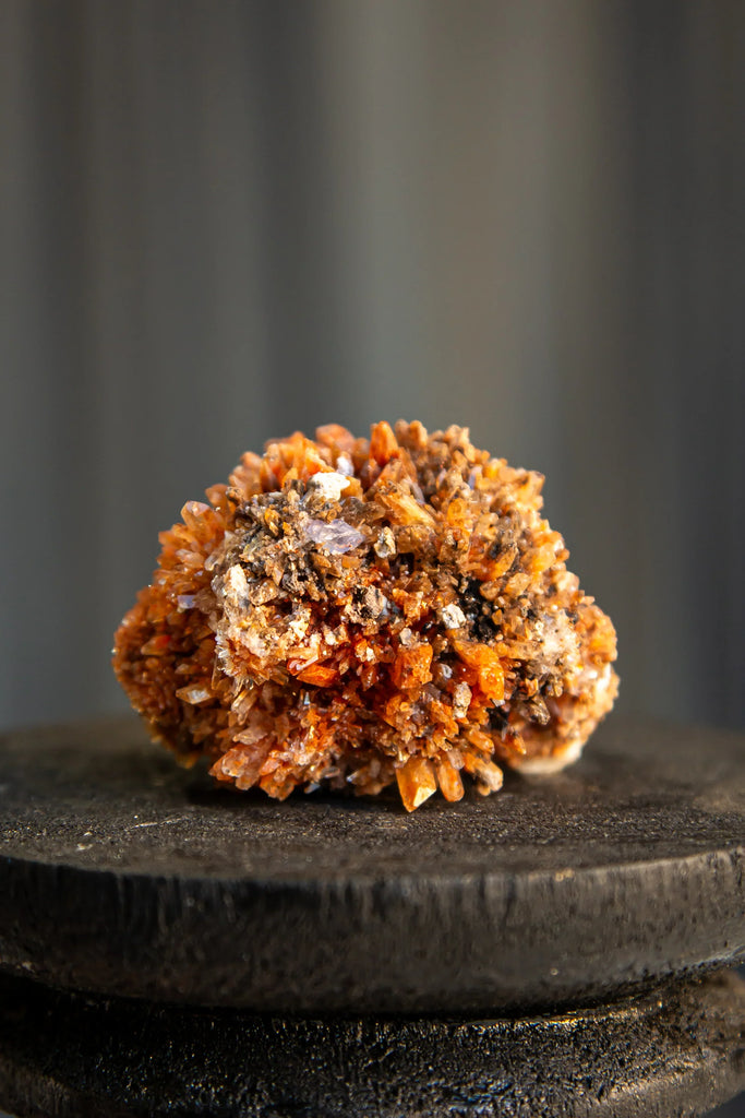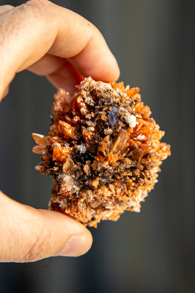 Creedite is a rare hydroxylhalide mineral typically found in hydrothermal veins. It often forms radiating crystal sprays in orange, purple, white, or colourless varieties. First discovered in Creede, Colorado (yep, that’s where the name comes from), it’s now famously sourced in Mexico—especially the bright orange and violet clusters from Chihuahua. Its fragile, needle-like crystals are as delicate as they are dazzling, so handle with care!