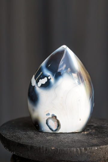 On the science side, Orca Agate is a type of banded Chalcedony, part of the Quartz family, with beautiful black and white patterns resembling the orca whale. Its unique aesthetic and calming energy make it a standout in any collection.