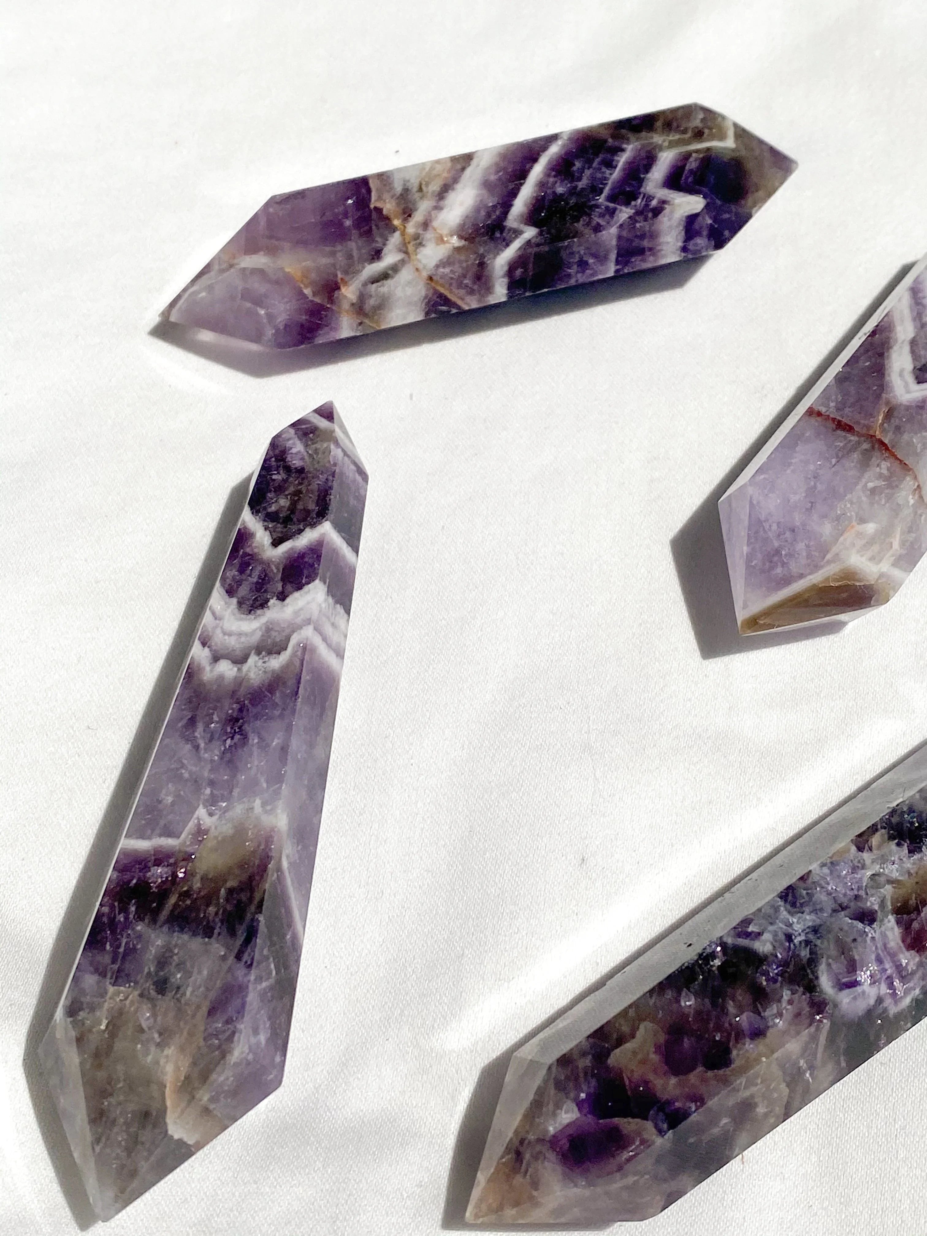 📝 Chevron Amethyst is a combination of Amethyst and White Quartz, mixed together in a V-striped or banded pattern. Chevron Amethyst combines the strengthening and enhancing qualities of Quartz with the stress-relieving qualities of Amethyst.