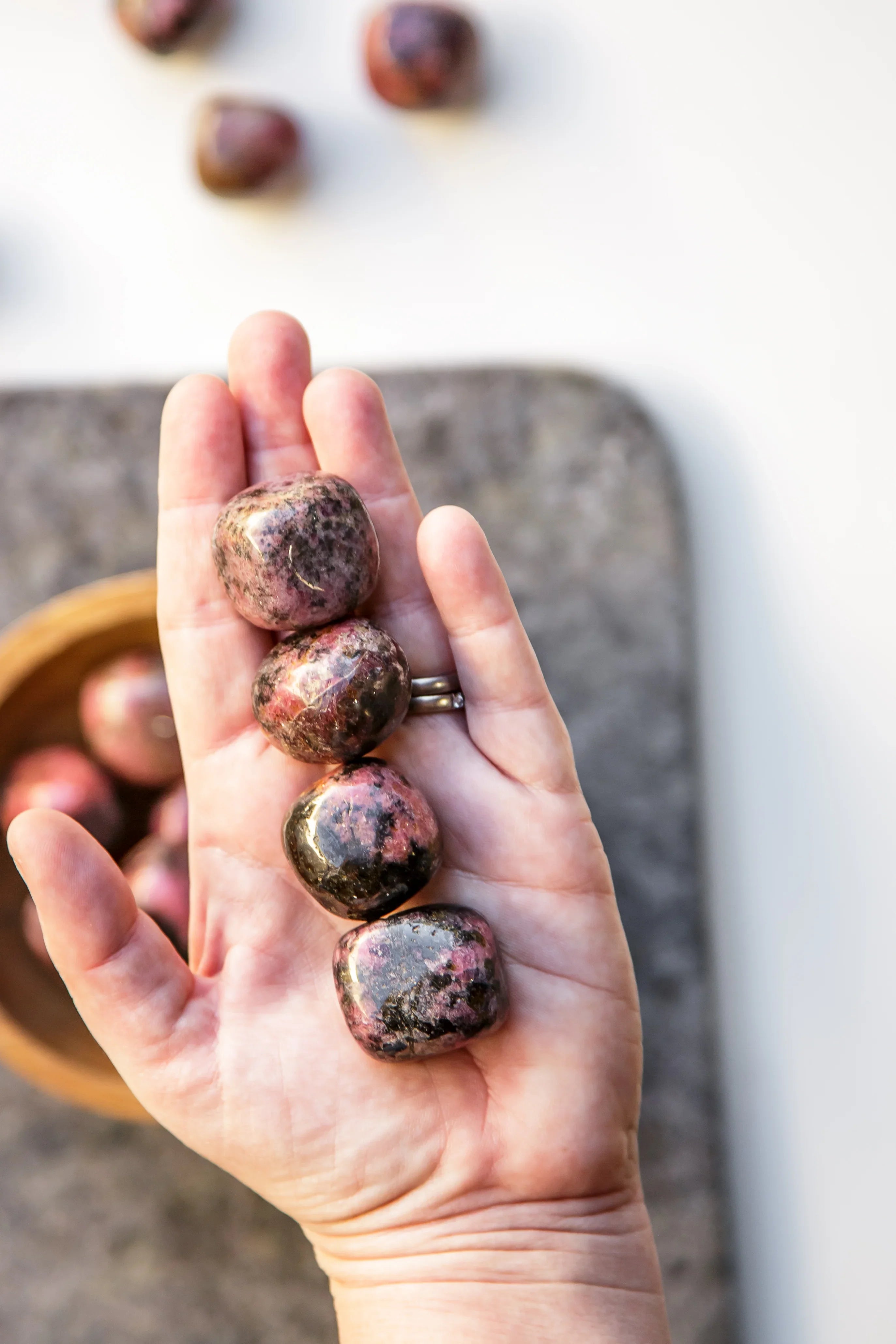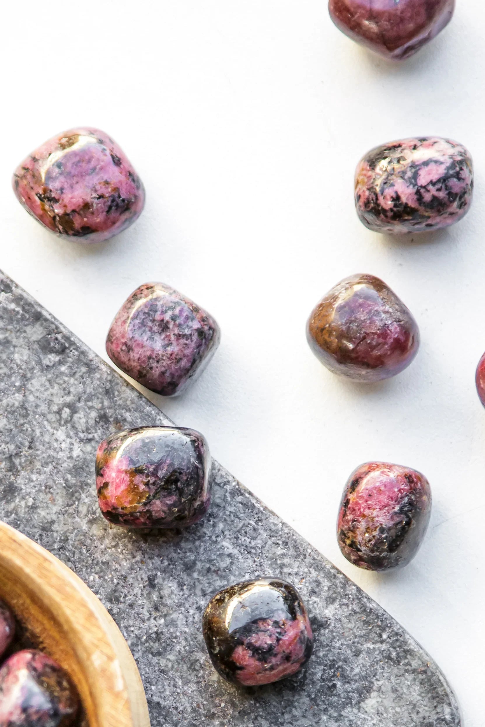 With its luscious pink base and dramatic black veining, Rhodonite is all about balancing the emotional scalesâbringing together love and strength, softness and boundaries, pain and growth. It doesnât just patch up heartbreakâit helps you transform it into wisdom.